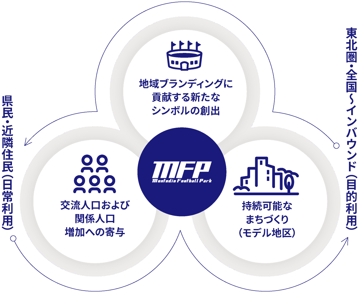 山形を繋ぐ~Rediscovery YAMAGATA~を合言葉に、新スタジアムの整備を通して、「地域ブランディングに貢献する新たなシンボルの創出」、「交流人口および関係人口増加への寄与」、「持続可能なまちづくり」を実現する交流・文化発信拠点の創造を目指してまいります。たった20日間しか稼働しない単なるスポーツ施設としての役割ではなく、山形県が直面している様々な課題を解決するとともに、将来にわたって持続可能なソリューションを提供できる場所を創ることを目指してまいります。